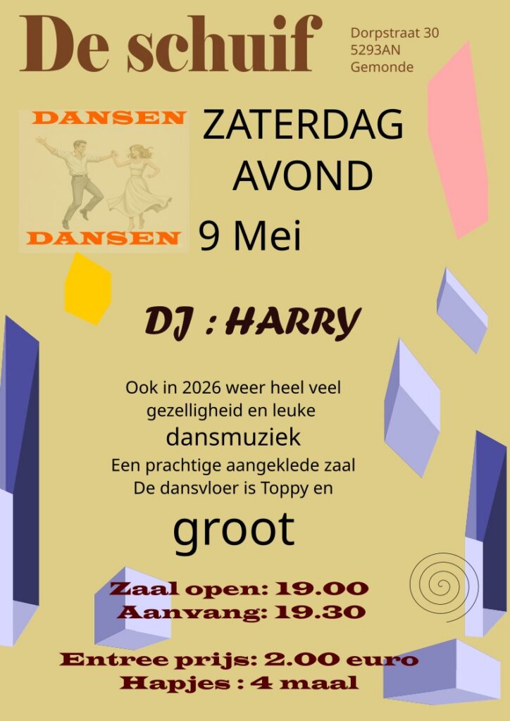 WOENSDAG 29 APRIL 2026: 19.30 – 23.30 UUR HARMONIEZAAL RIJSBERGEN lagestraat 1 cq 3 TELEFOON: 06 22 41 43 07. , € 6,50 entree incl. hapjes, DJ ’t Bootje. We dansen in een mooie zaal met eiken houten dansvloer en goede gezellige dansmuziek. Wij wisselen ballroom en Latijns-Amerikaanse dansen af met rijdansen en linedansen., ZODAT DEZE DANSAVOND OOK GESCHIKT IS VOOR ALLEENSTAANDEN EN PERSONEN ZONDER PARTNER !! Zaal is open vanaf 19.15 uur. Wij draaien NON STOP en houden geen pauze, houden nooit een vakantie of zomerstop. U heeft bij ons altijd garantie dat wij kunnen dansen. Aanmelding gewenst via gmm.boot@hetnet.nl GRATIS DANSLES OP IEDERE DINSDAGAVOND Overige informatie op : www.bootrijsbergen.nl